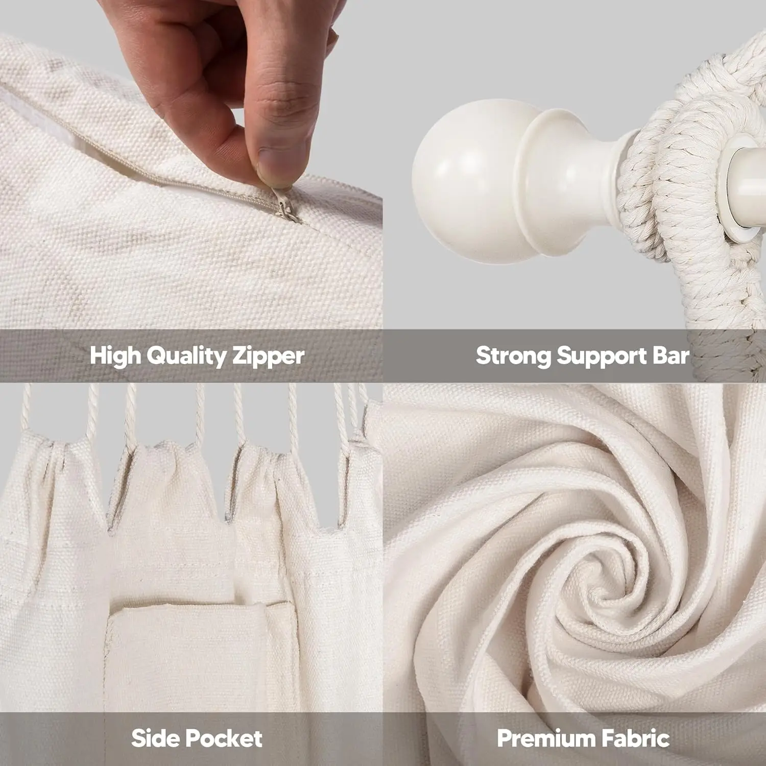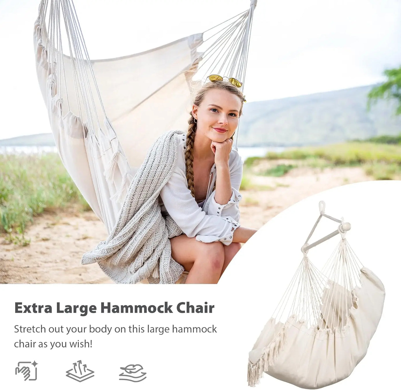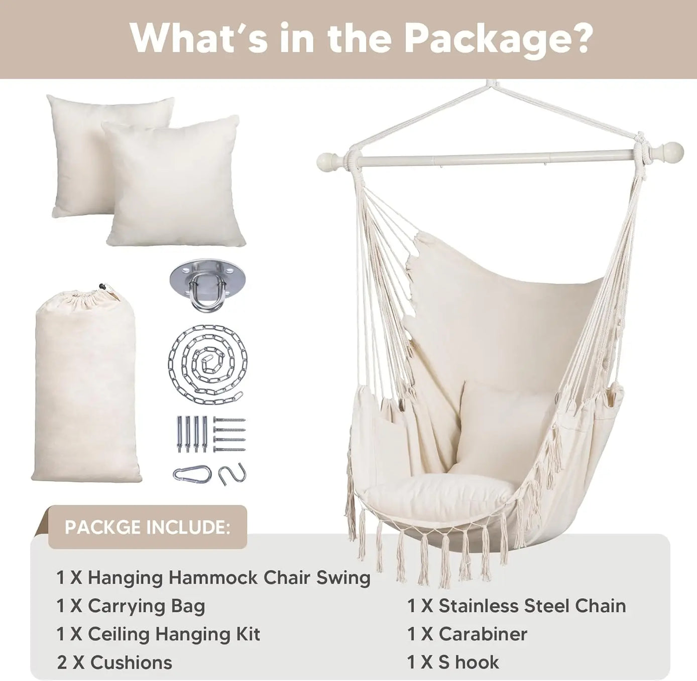 Extra Large Macrame Hanging Swing Chair with Side Pocket and Cushions, Max 450lbs Capacity, Beige