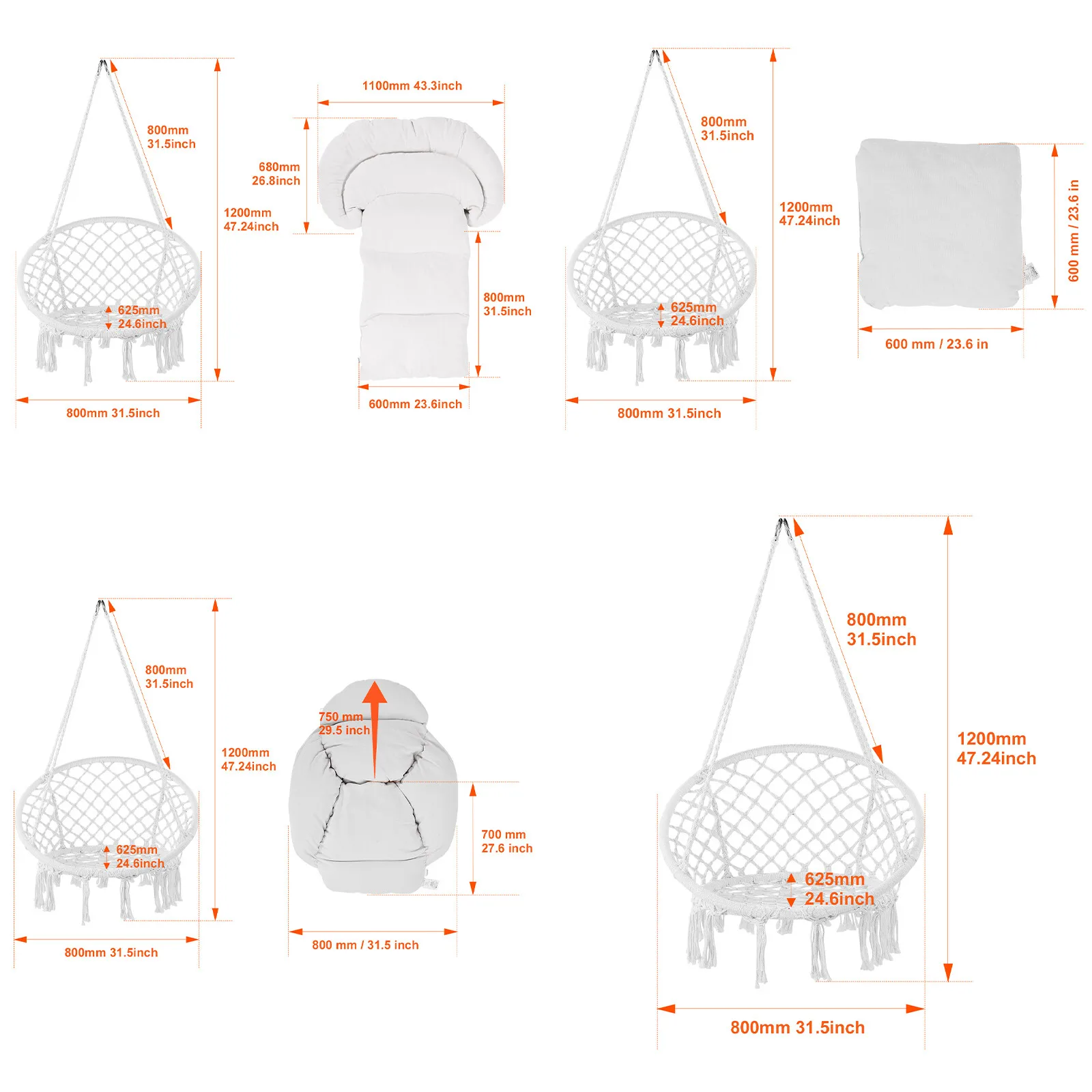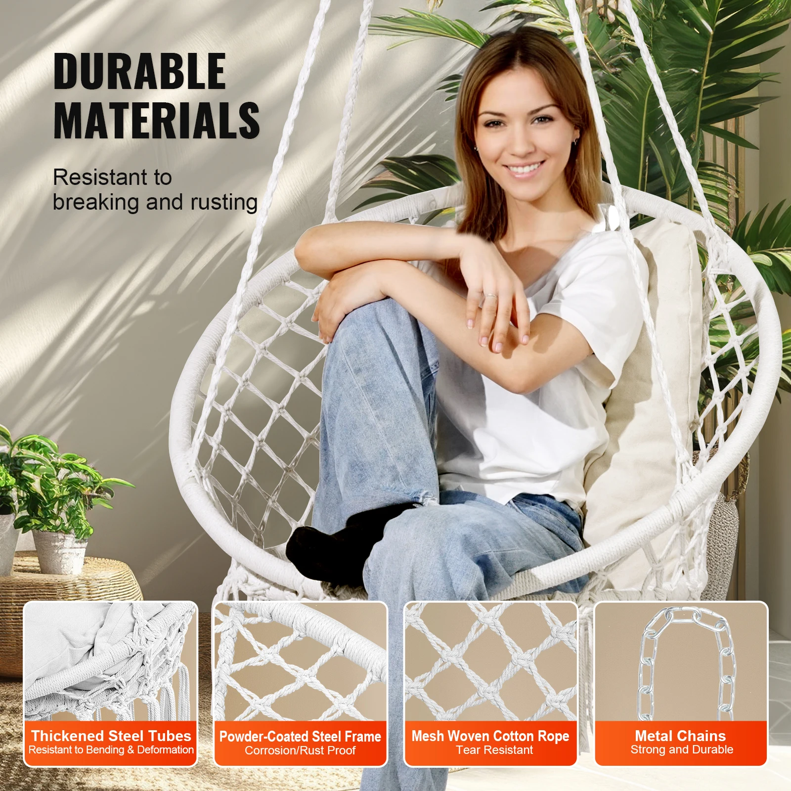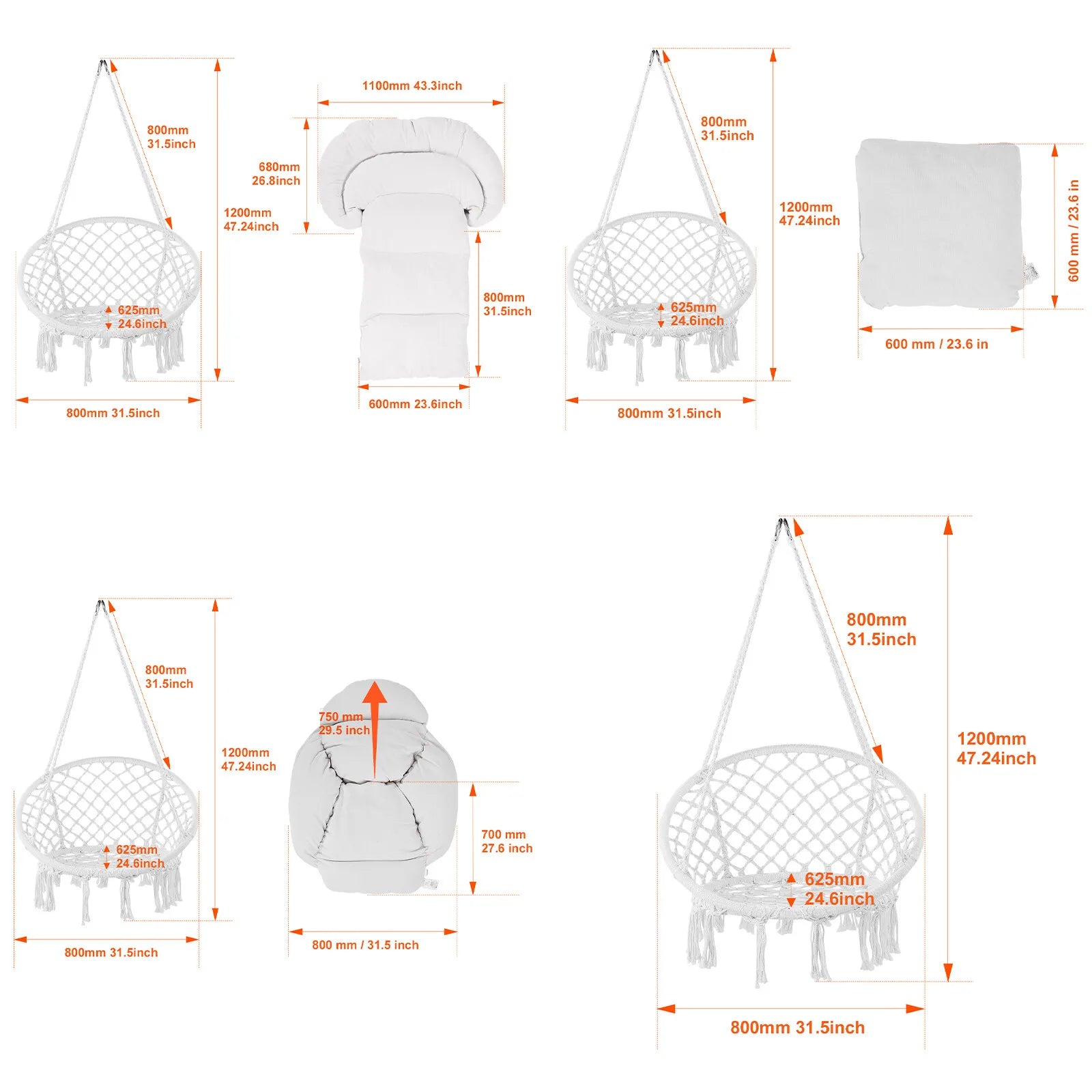 Engineered for durability, this macramé hanging chair combines a reinforced steel frame with woven mesh rope construction to support up to 264/330 lbs safely. The plush PP cotton-filled cushion delivers comfort while remaining breathable and machine-washable. Installation is straightforward with included hardware—metal rings, 60-inch chain, carabiners, ceiling plate, and mounting bolts—allowing you to hang from ceiling joists, tree branches, or stands. The foldable design maximizes storage efficiency when not in use. Blending bohemian aesthetics with functional design, this versatile chair suits bedrooms, patios, and reading nooks alike, serving equally well as a relaxation spot or gentle swing for indoor and outdoor environments.