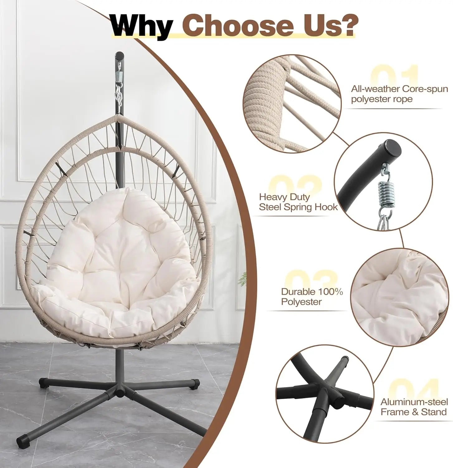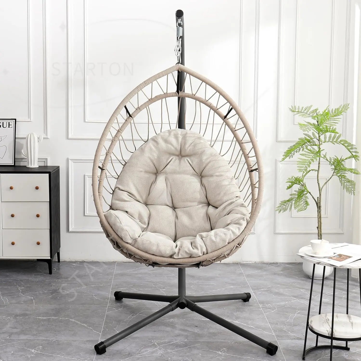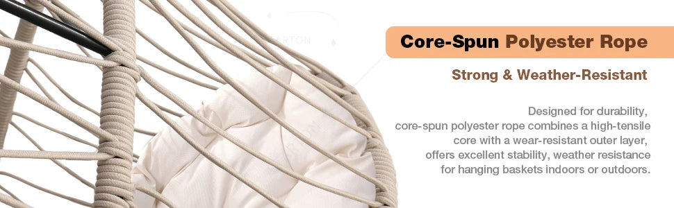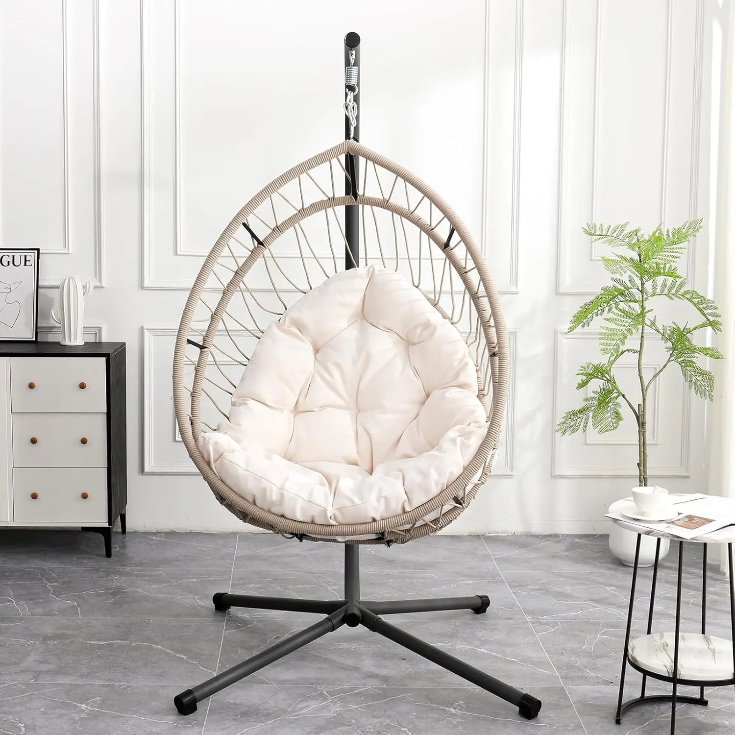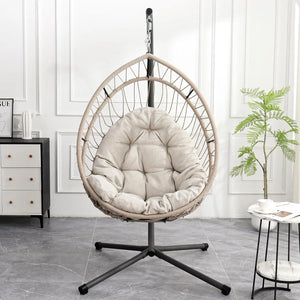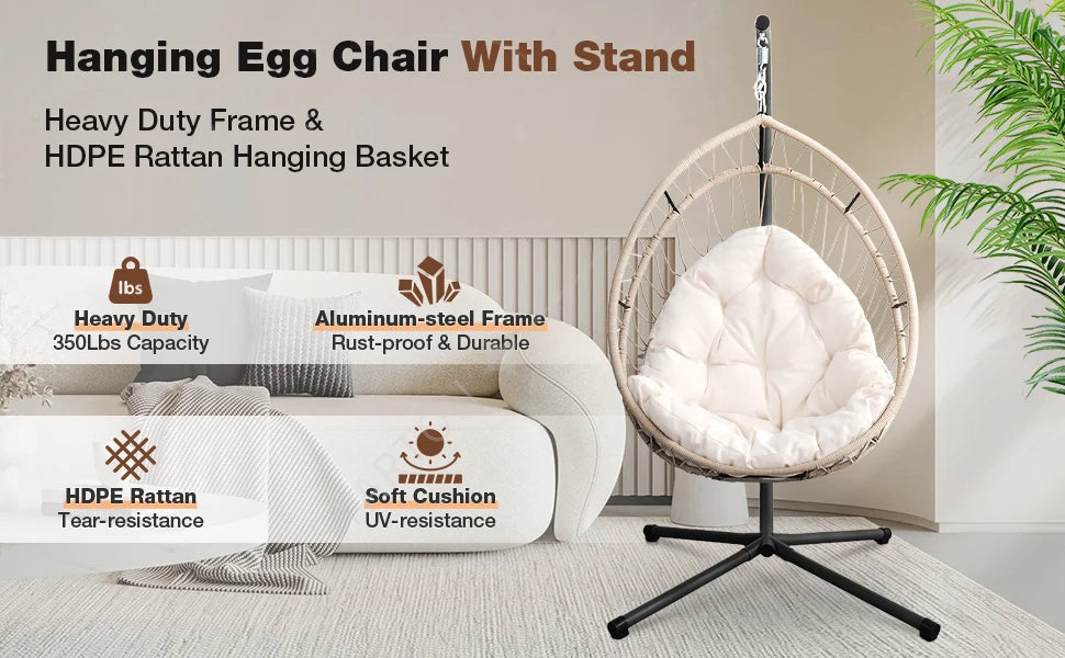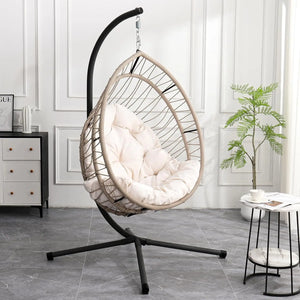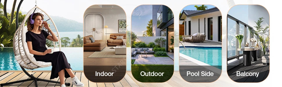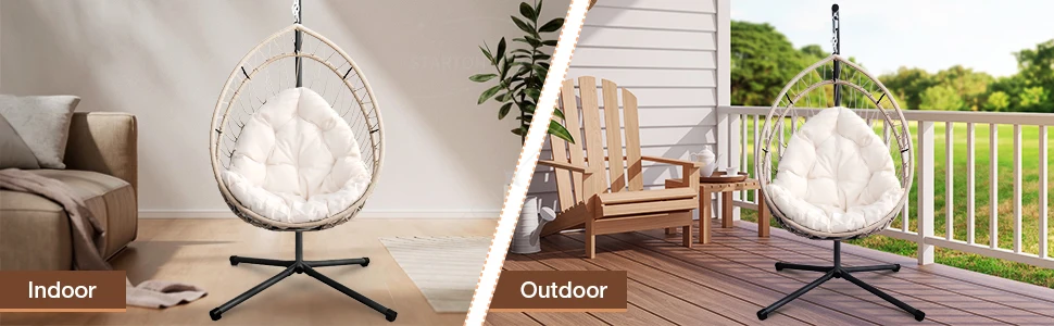 Our indoor swing features a sturdy frame paired with hand-woven rattan or high-quality synthetic wicker and a plush cushion for comfort — designed to be beautiful and long-lasting. Most indoor egg chair swings use durable materials that support everyday lounging.
