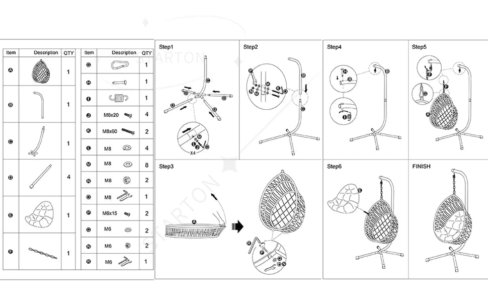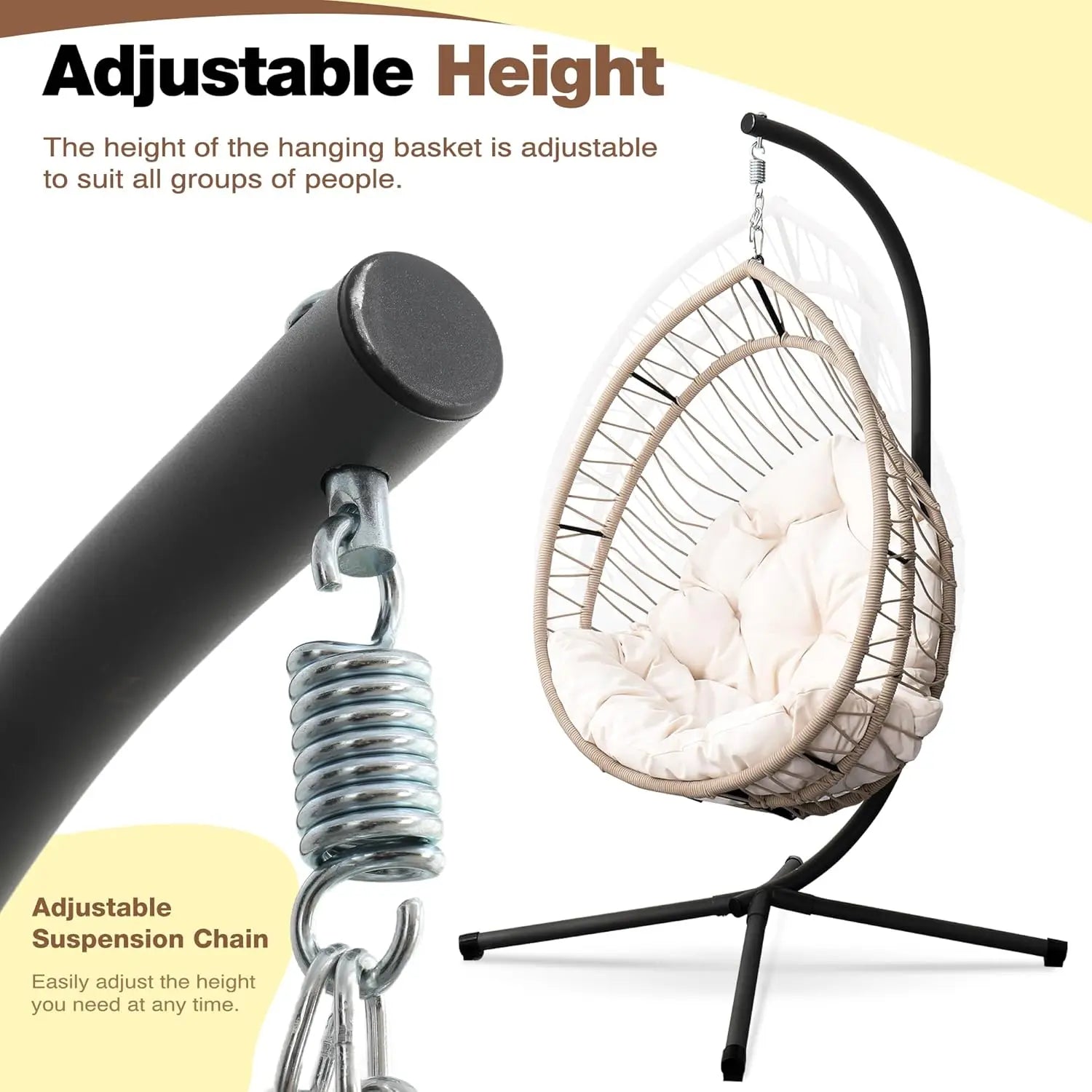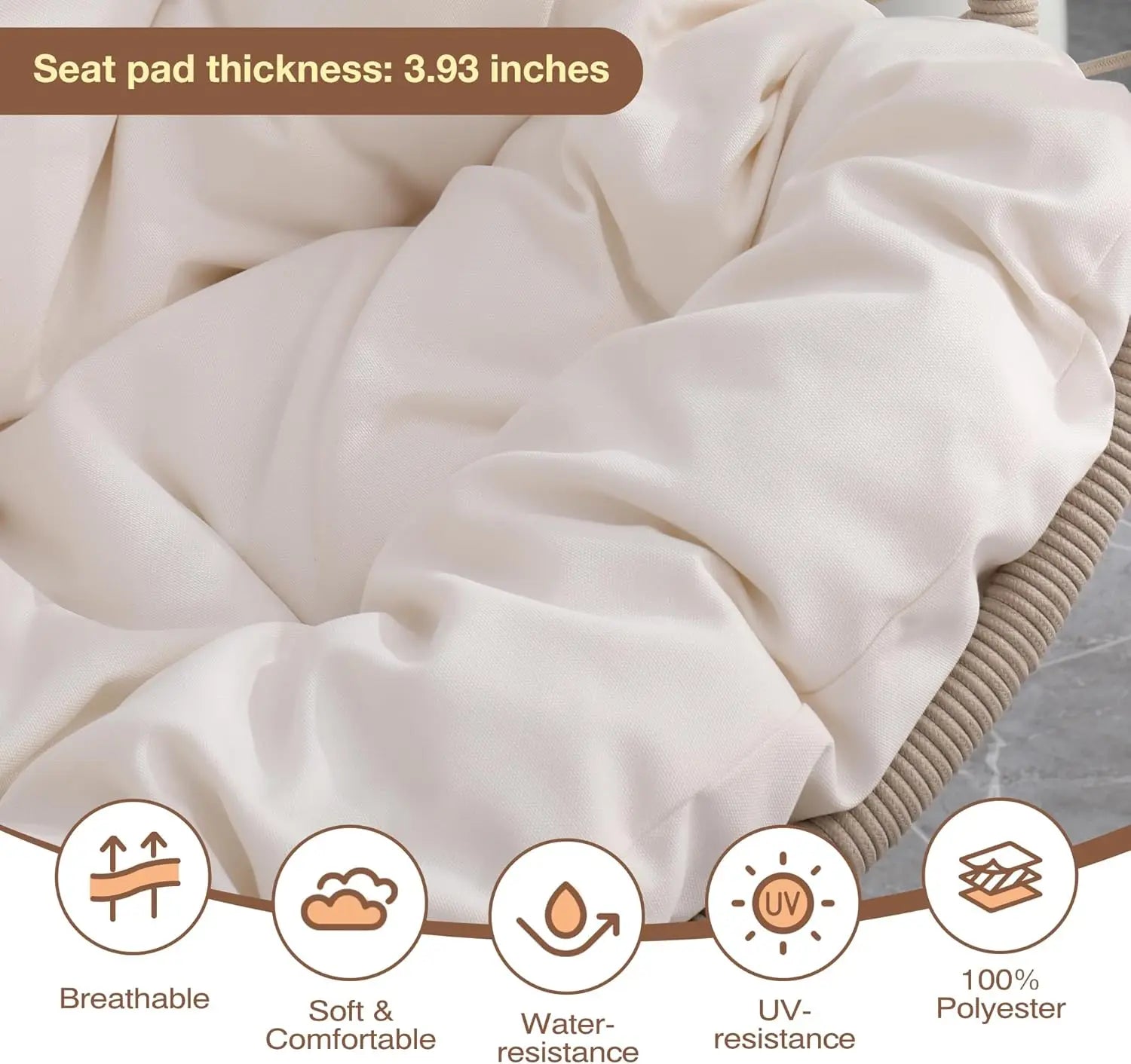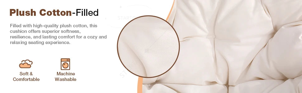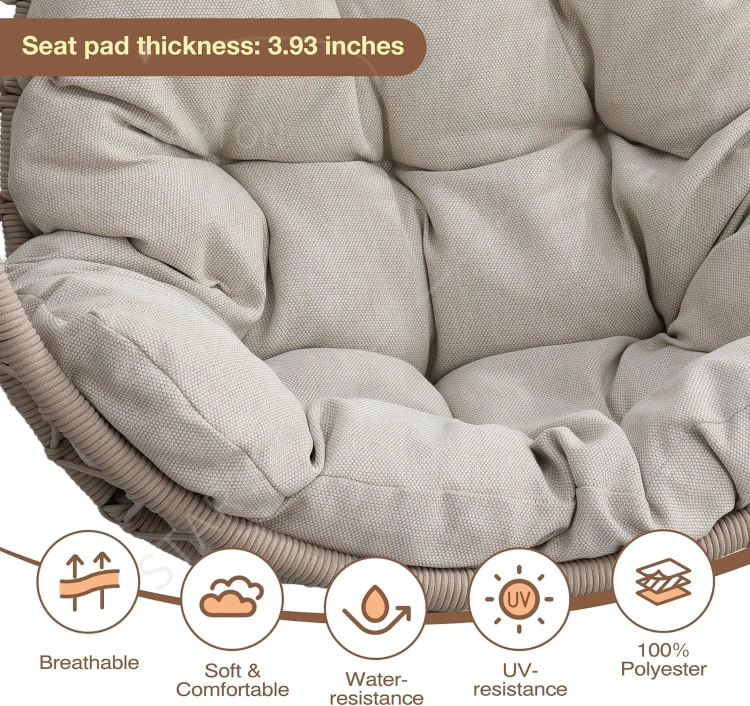 Our indoor swing features a sturdy frame paired with hand-woven rattan or high-quality synthetic wicker and a plush cushion for comfort — designed to be beautiful and long-lasting. Most indoor egg chair swings use durable materials that support everyday lounging.