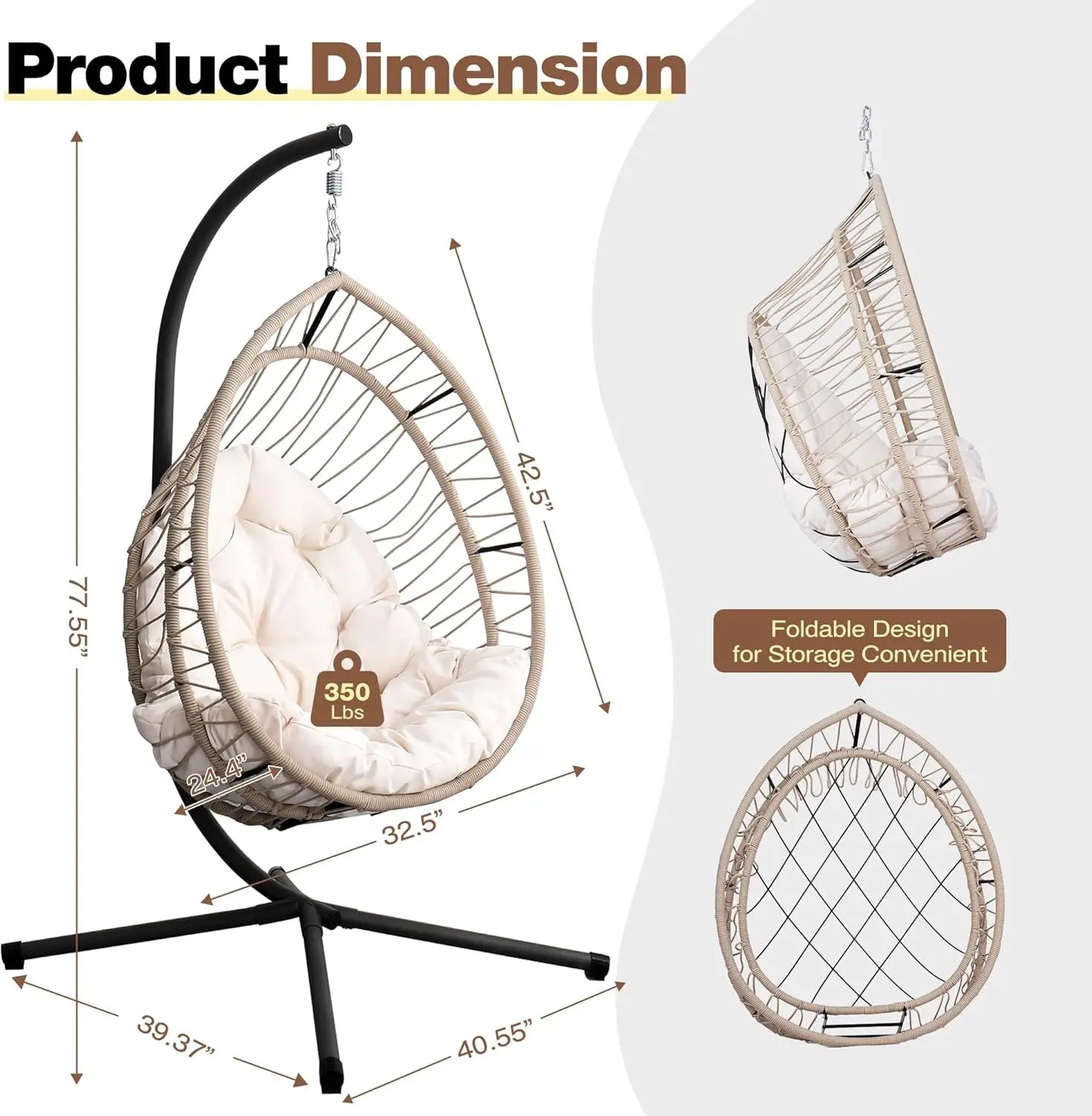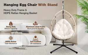 The size and capacity vary slightly by model, but most indoor hanging egg chairs support approximately 250–350 lbs and offer generous seating space for relaxing, reading, or napping.